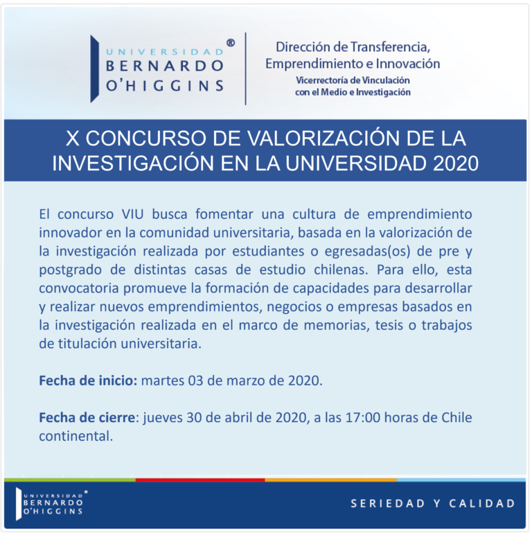 La DTEI invita a todos los alumnos a postular al X Concurso de Valorización de la Investigación en la Universidad VIU 2020. Qué busca: Fomentar una